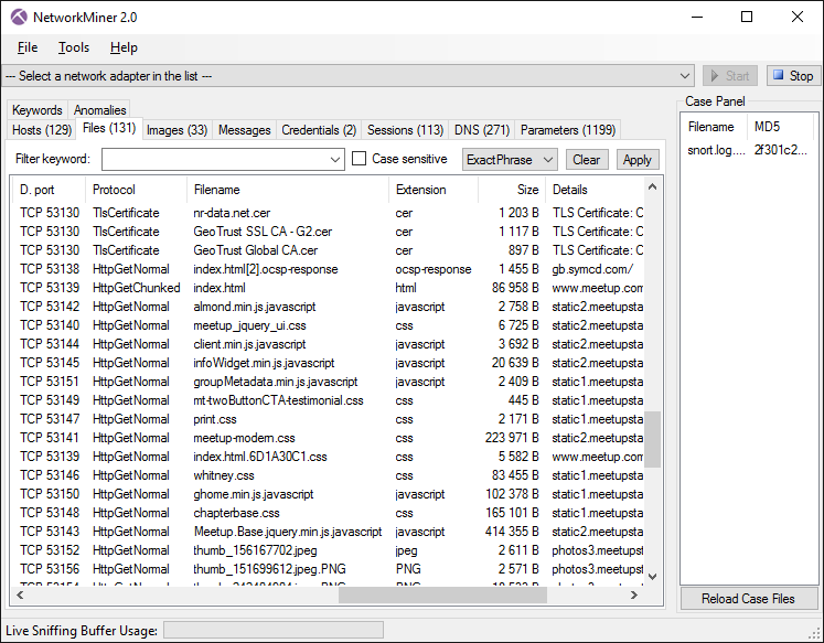 NetworkMiner is a Network Forensic Analysis Tool (NFAT) for Windows (but also works in Linux / Mac OS X / FreeBSD). NetworkMiner can be used as a passive network sniffer/packet capturing tool in order to detect operating systems, sessions, hostnames, open ports etc. without putting any traffic on the network. NetworkMiner can also parse PCAP files for off-line analysis and to regenerate/reassemble transmitted files and certificates from PCAP files. NetworkMiner makes it easy to perform advanced Network Traffic Analysis (NTA) by providing extracted artifacts in an intuitive user interface. The way data is presented not only makes the analysis simpler, it also saves valuable time for the analyst or forensic investigator. NetworkMiner has, since the first release in 2007, become a popular tool among incident response teams as well as law enforcement. NetworkMiner is today used by companies and organizations all over the world.