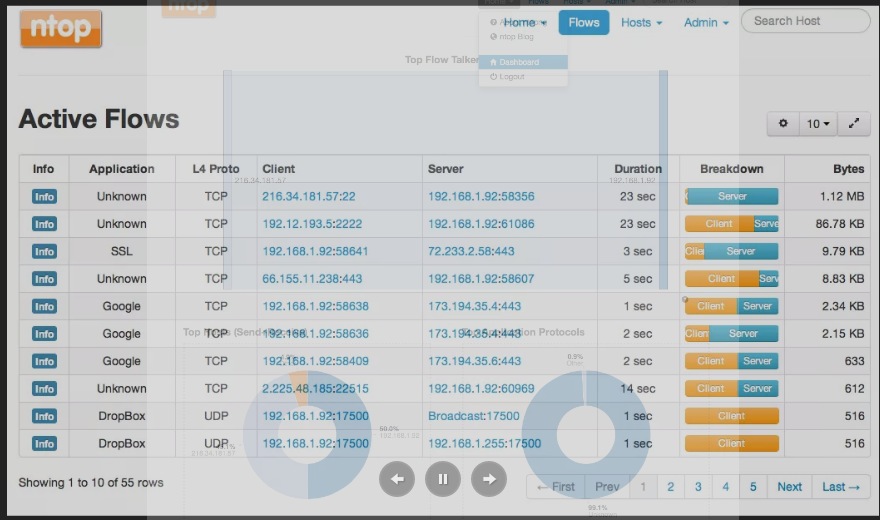 ntopng is the next generation version of the original ntop, a network traffic probe that shows the network usage, similar to what the popular top Unix command does. ntopng is based on libpcap and it has been written in a portable way in order to virtually run on every Unix platform, MacOSX and on Windows as well. ntopng users can use a a web browser to navigate through ntop (that acts as a web server) traffic information and get a dump of the network status. In the latter case, ntopng can be seen as a simple RMON-like agent with an embedded web interface. The use of: